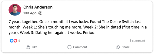The Desire Switch Method is different because it actually focuses on what creates attraction at a psychological level in a way that makes sense. You learn the hidden polarity principles, understand what killed the spark, and get simple daily actions that naturally rebuild chemistry – instead of forced date nights and awkward conversations.